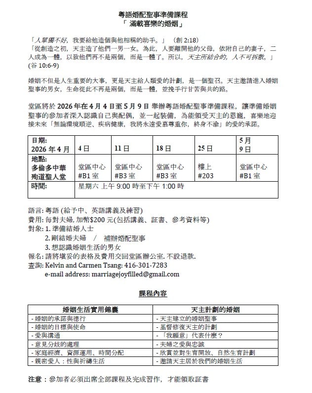 「滿載喜樂的婚姻」粵語婚配聖事準備課程將於 2026年4月4日至5月9日舉行。